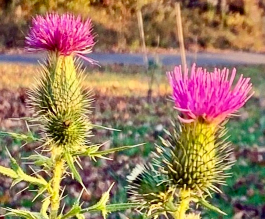 Why the Thistle? Some people see a thistle and think it’s only a weed. Legend has it that this humble plant once saved a group of sleeping Scot warriors from an ambush when the enemy stepped on the thorny prickles of a thistle and cried out! The Scotsmen rose and vanquished the enemy. And thus, this prickly pink flower became the National Flower of Scotland! The “Order of the Thistle” bestowed only by the King, is one of the highest honors bestowed to an individual for outstanding contribution to Scotland and the UK.